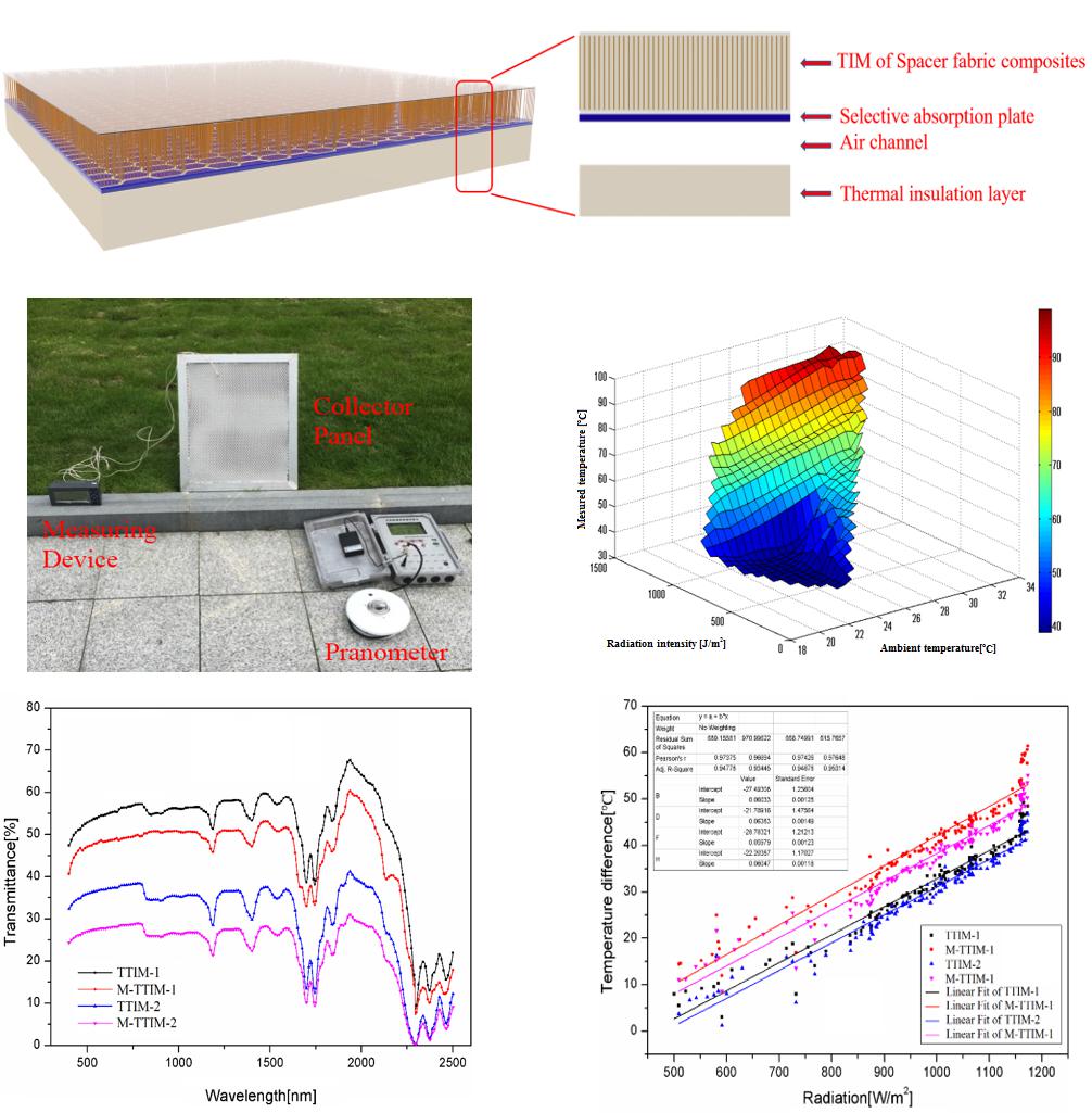 该团队还在纺织基太阳能空气集热器热效能理论分析研究的基础上,构建了计算纺织基太阳能空气集热器组热效能的数学模型,并模拟计算了纺织基太阳能空气集热器在不同结构参数、入口参数、光学参数和环境参数的情况下,集热器的出口温度、吸热层温度、有用能、效率因子以及热迁移因子等性能指标。并应用所建立的数学模型,制备了初期产品装置,进行了室外太阳能集热试验,验证了所设计系统的有效性,并验证了相关模拟结果的正确性。