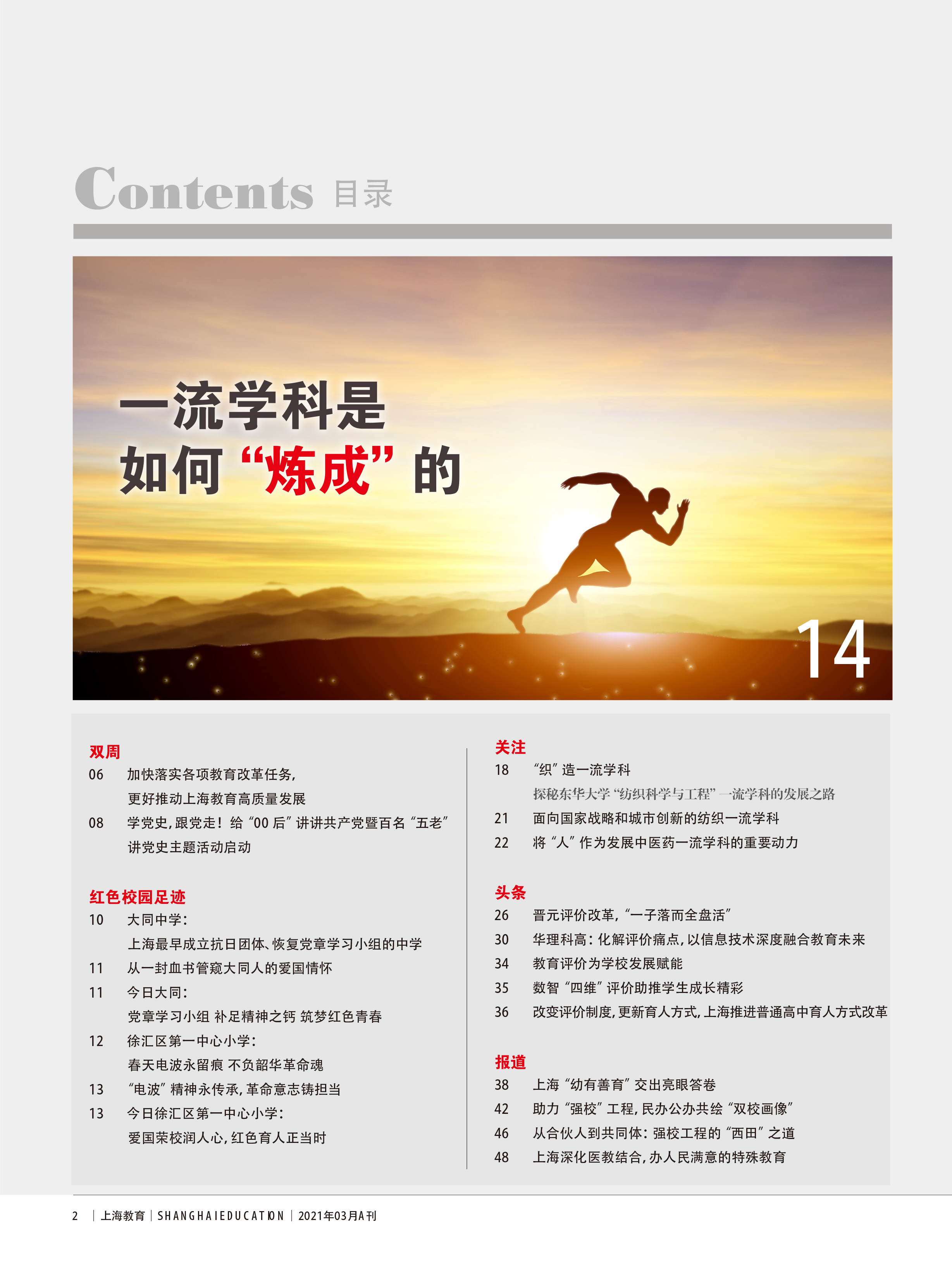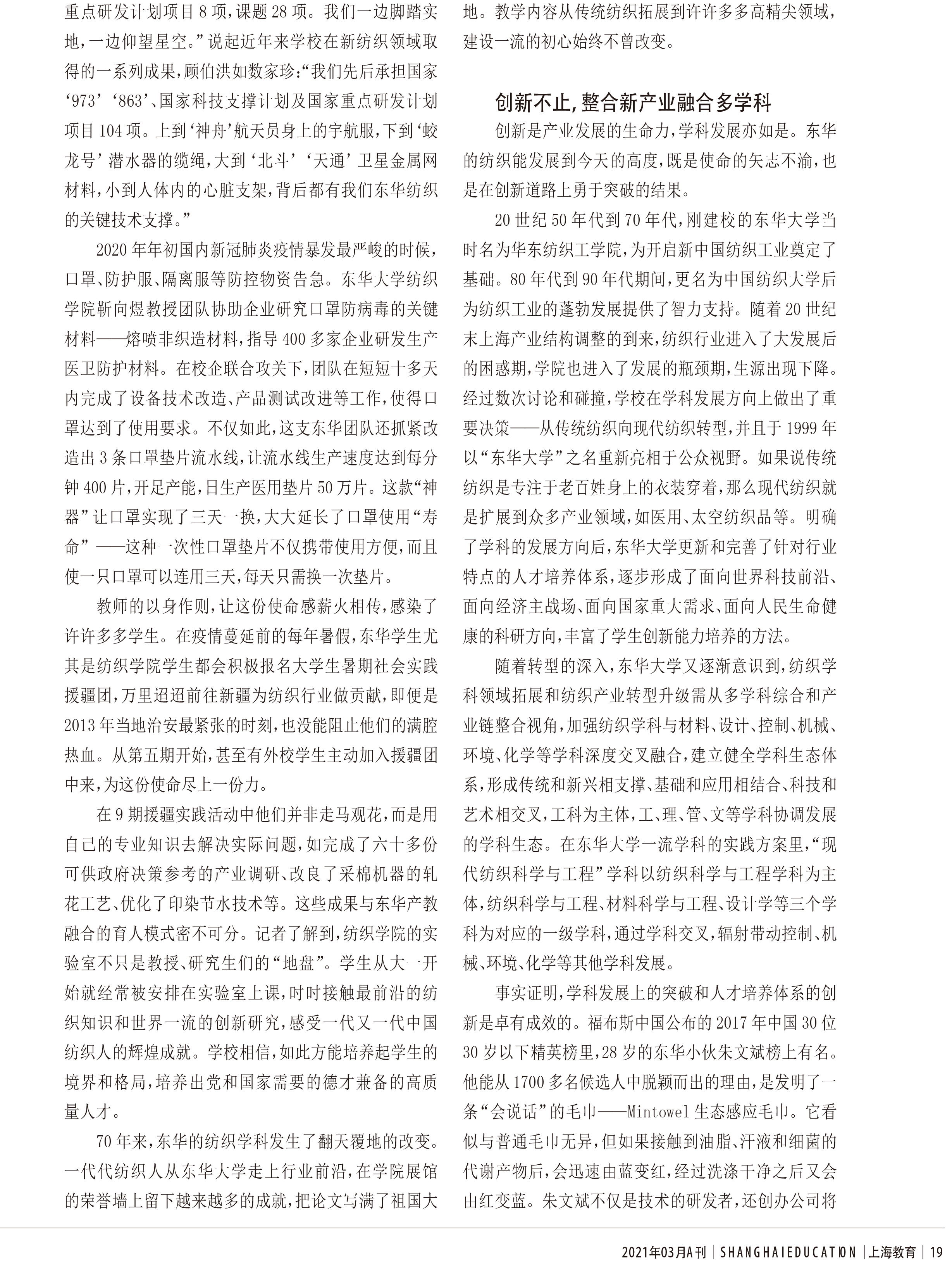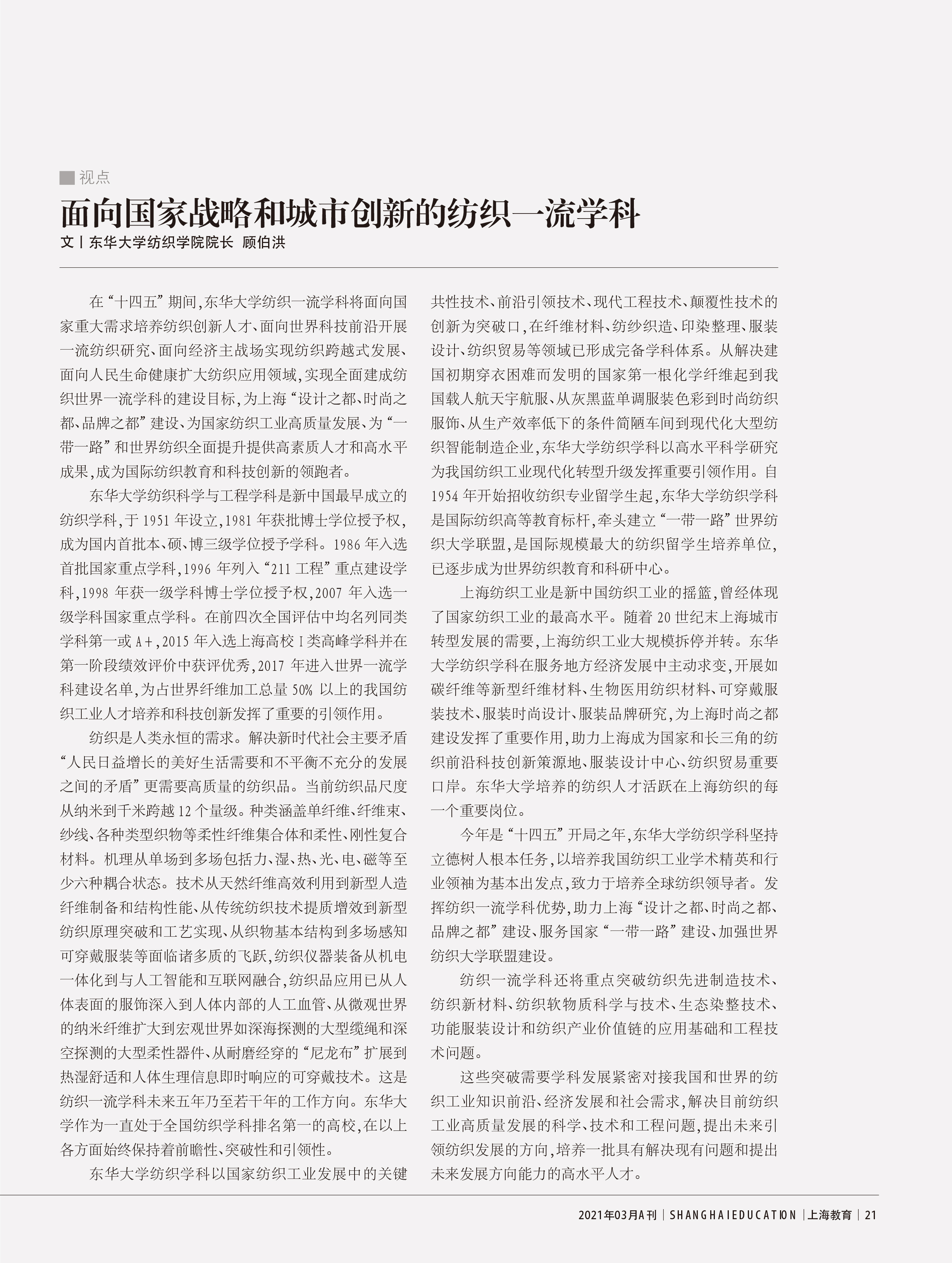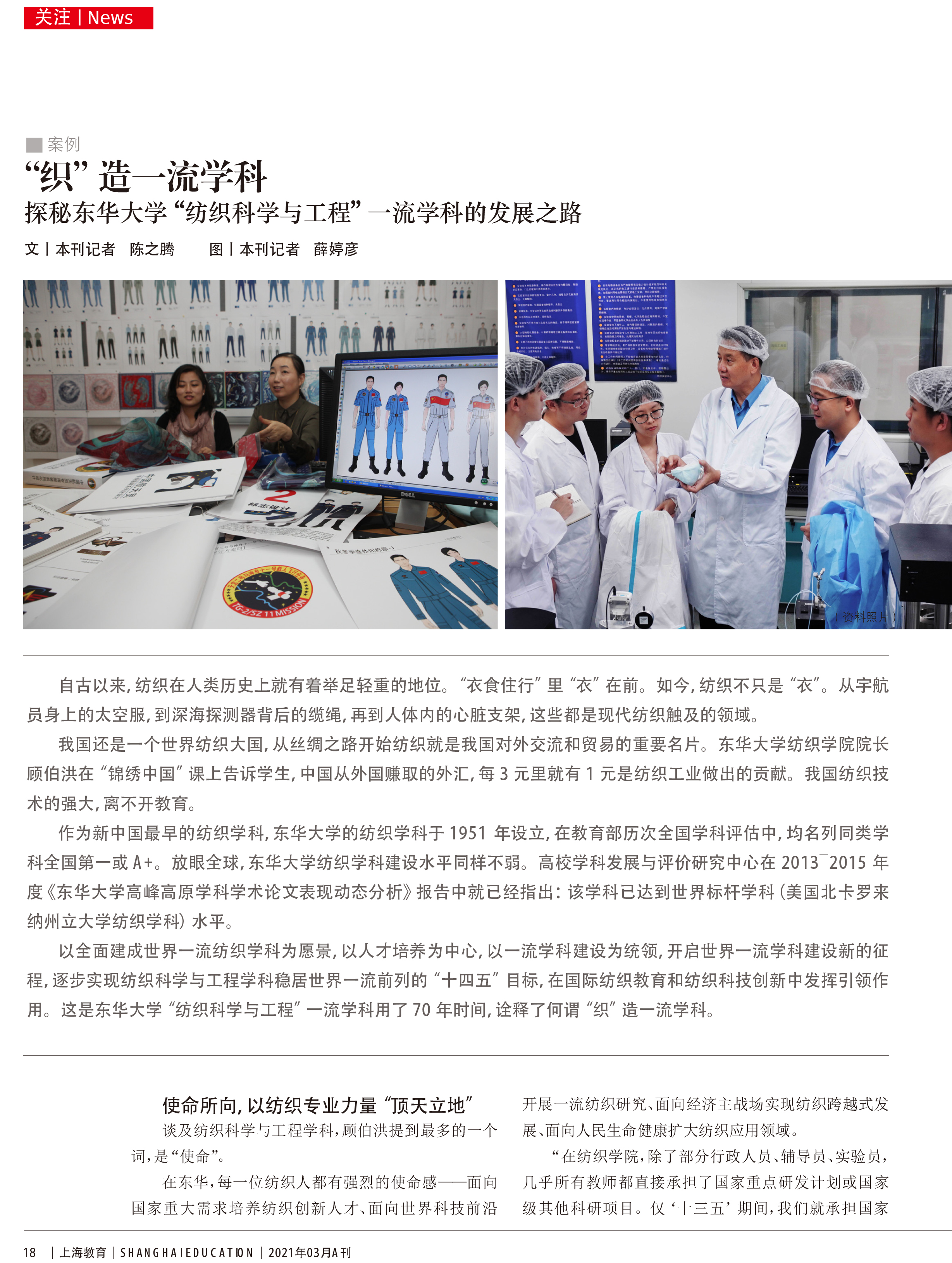 3月1日,《上海教育》2021年3月A刊报道世界一流学科建设情况,发表专题文章《“织”造一流学科 探秘欲漫涩 “纺织科学与工程”一流学科的发展之路》,及顾伯洪院长署名文章《面向国家战略和城市创新的纺织一流学科》。文章从使命所向,以纺织专业力量“顶天立地”;创新不止,整合新产业融合多学科;国际视野,引领世界纺织新发展等方面详细介绍了“纺织科学与工程”一流学科的发展道路。