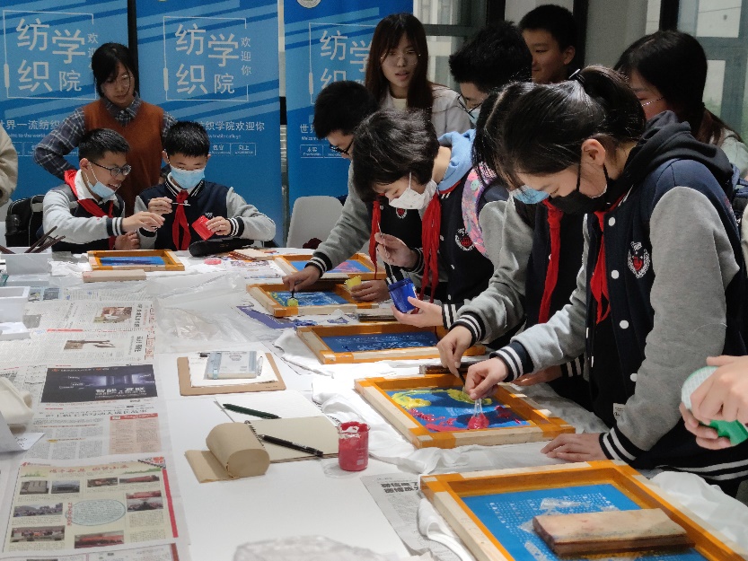 此次开放日活动分为3个板块:一流学科展示区利用220平方米展厅全方位展现欲漫涩 一流纺织学科的概况和发展历程,陈列展品近百件,涵盖近年多个代表性成果,彰显了纺织学科的内涵和综合实力;纺织科普体验区通过生动的科普图片介绍和多形式织造小样机的动手实操,知行合一,使同学们对纺织涵义有了进一步理解;彝绣元素产品设计展通过非遗文化介绍,彝绣元素服装、配饰和文创产品的展示及手绘帆布袋和丝网印花T恤的手工活动体验,让同学们亲身体验了中华传统文化元素在纺织品设计中的应用与传承。各板块活动如火如荼地进行,每个区域配备了志愿者给同学们讲解和演示,从什么是纺织、如何纺纱织布,到纺织品设计的多样化展示以及纺织材料在多领域的广泛应用,涉及纺织行业的多方面。当谈起纺织品不仅可以满足我们日常衣食住行的需求,而且可以被做成人造血管、太阳帆板材料等在医学和航天领域应用时,同学们纷纷惊叹不已,纺织产品可谓无处不在、无时都有。