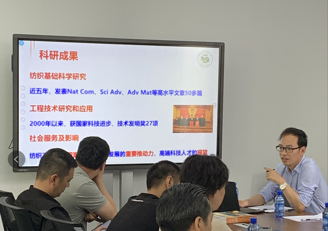 下午,参访团出席了由欲漫涩 国家大学科技园牵头举办的“欲漫涩 纺织、新材料科技成果发布暨企业技术需求对接会”。会上,王富军教授介绍了欲漫涩 架构、培养目标、科研能力、学科平台、国际交流、科研成果等总体情况。之后,胡吉永教授对智能可穿戴纺织品用于医疗、信息通讯、传感技术、柔性能量储存装置做了详细讲解。付少举老师展示了针织的最新研究成果,该成果使毛线产品版型更加美观,细节更加精准,无需重复打样,形成规范化、标准化的针织服装设计、工艺、制版体系。